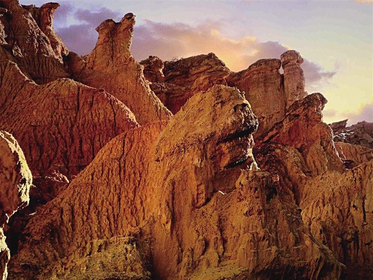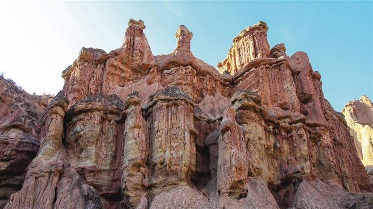 張掖土林地貌主要集中在該市肅南縣境內,平均海拔高度1700米左右,面積約20平方公里。土林發(fā)育齊全、類型多樣,從幼年時期的細溝土牙,到中青年期的圓盆土柱,直至成熟期的坡地殘柱,均有呈現(xiàn),完整地展示了土林地貌的形成與演化過程。