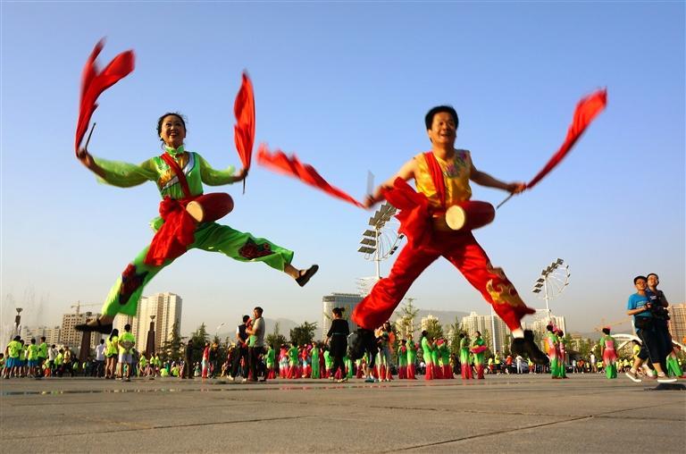 第一表演區(qū):奧體中心主會(huì)場(chǎng)廣場(chǎng),表演內(nèi)容:太平鼓、扇子舞、健身秧歌“黃河蘭州”、啦啦操;