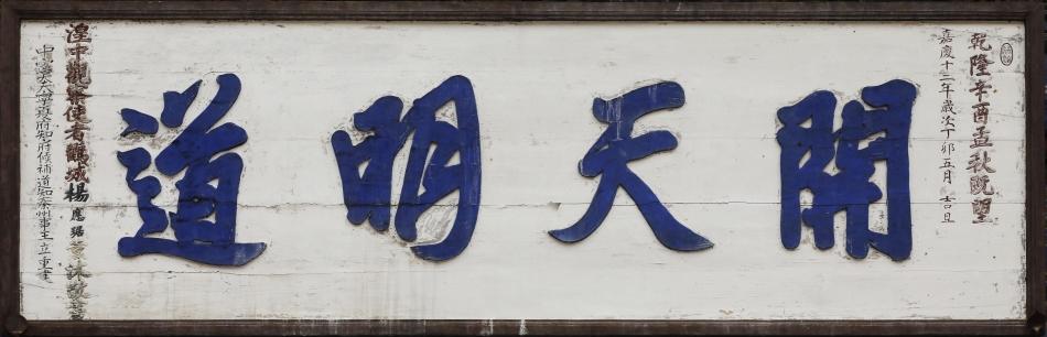 該匾懸于天水伏羲廟大門前牌坊正中。長3.5米,寬1.25米,厚0.12米。素邊,匾心白底藍(lán)字,上下款朱書。此匾有雙上款和雙下款。第一個(gè)上款為“乾隆辛酉孟秋既望”,下款為“湟中觀察使者遼海楊應(yīng)琚薰沐敬書”;第二個(gè)上款為“嘉慶十二年歲次丁卯五月吉旦”,下款為“中憲大夫?qū)幭母蜓a(bǔ)知秦州事王公重建”。