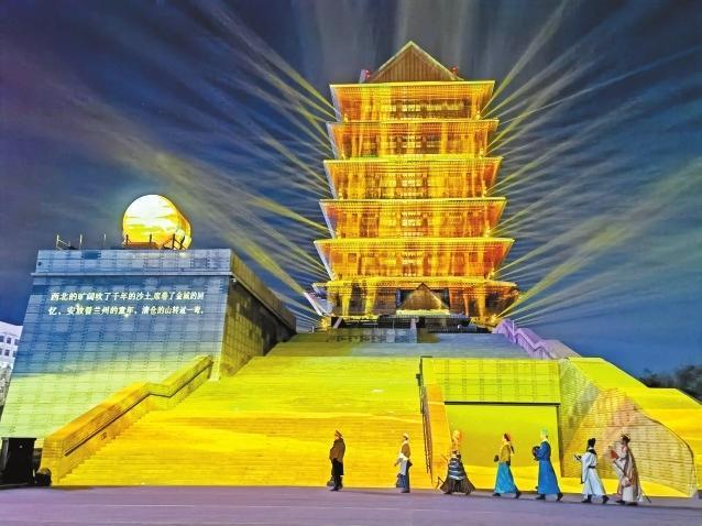 在黃河樓景區(qū),平時只有周末觀演的“黃河頌·大有蘭州”多媒體實景演出開啟了為期一個月的常態(tài)化巡演,每晚9時,璀璨的光影映襯著巍峨雄壯的黃河樓,在3D Mapping多媒體技術的加持下,帶給游客難忘的光影夜游體驗。而近日黃河樓入園游客較平時也增長了3倍之多,登樓參觀人數(shù)日均達到3000人次。