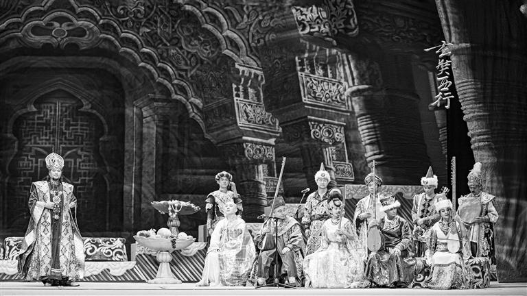 《玄奘西行》靠音樂的轉(zhuǎn)換,把人物內(nèi)心通過音樂表達(dá)出來,將人物的心理變化賦予戲劇張力。姜瑩給甘肅省歌舞劇院演出的《玄奘西行》專門配了一版交響樂的伴奏,希望通過交響樂把底子鋪好,通過交響樂和民樂的融合達(dá)到氣勢恢宏的效果。