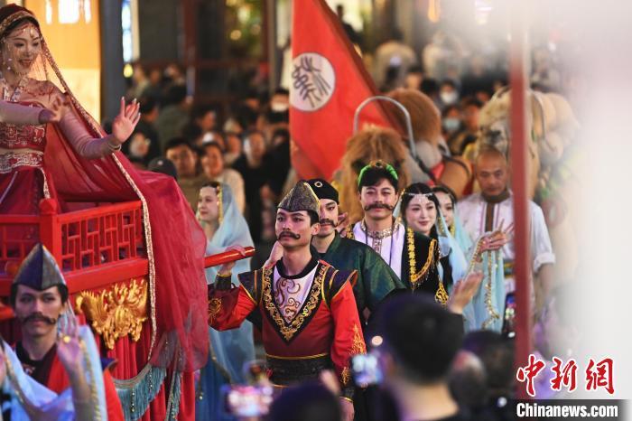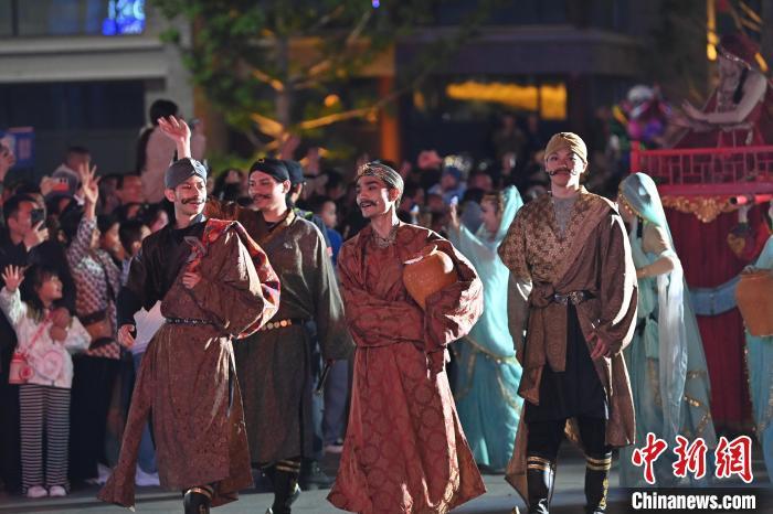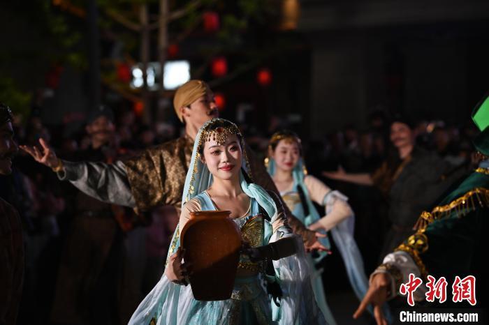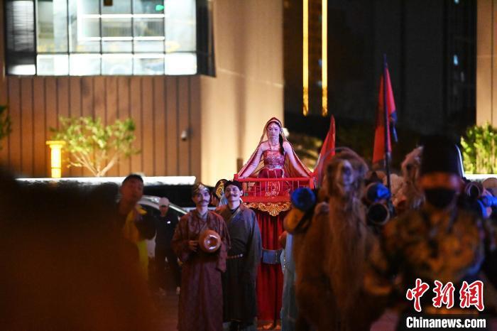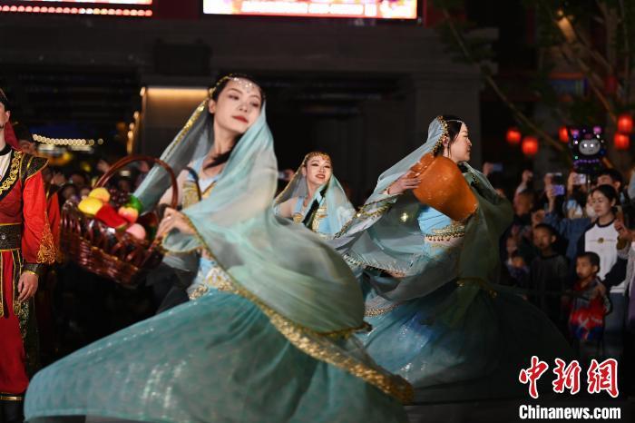 5月3日晚,甘肅省蘭州市七里河區(qū)蘭州老街上演的大型情景巡游《樓蘭之旅》吸引游客。李亞龍 攝