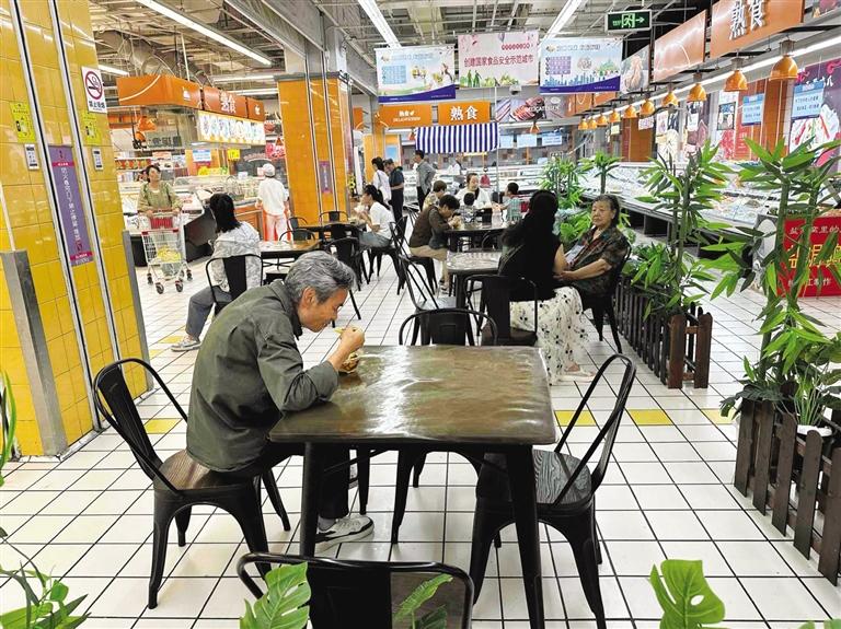 超市里的“平價食堂”,成為打造一刻鐘便民生活圈的重要載體。“超市周邊的居民、上班族、學生、酒店差旅客群的基礎(chǔ)比較大,所以增加快餐、堂食也是超市的一項便民舉措。”超市里升騰起的煙火氣,也讓超市的來客率明顯提升,“周末時,油條的銷量能達到1000根、豆腐腦能賣到500碗,不管是檔口、自助收銀機都有排隊的顧客。”