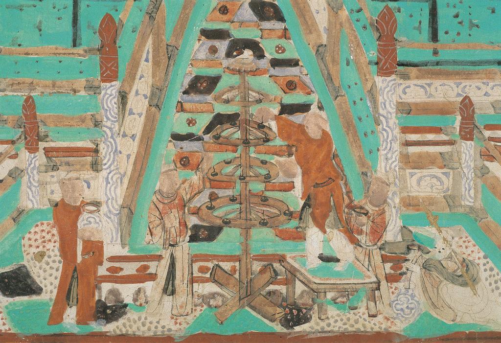 花好月圓夜,人們擺設(shè)香案、放置供品,敬奉月神。敦煌研究院介紹,在莫高窟第103窟的壁畫中,描繪了古人們頭頂明月、圍繞寶塔祭拜的場(chǎng)景。