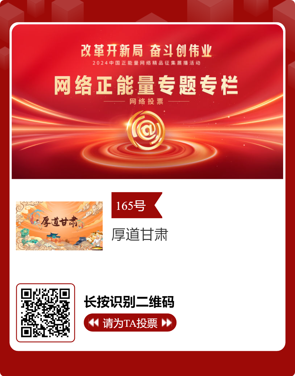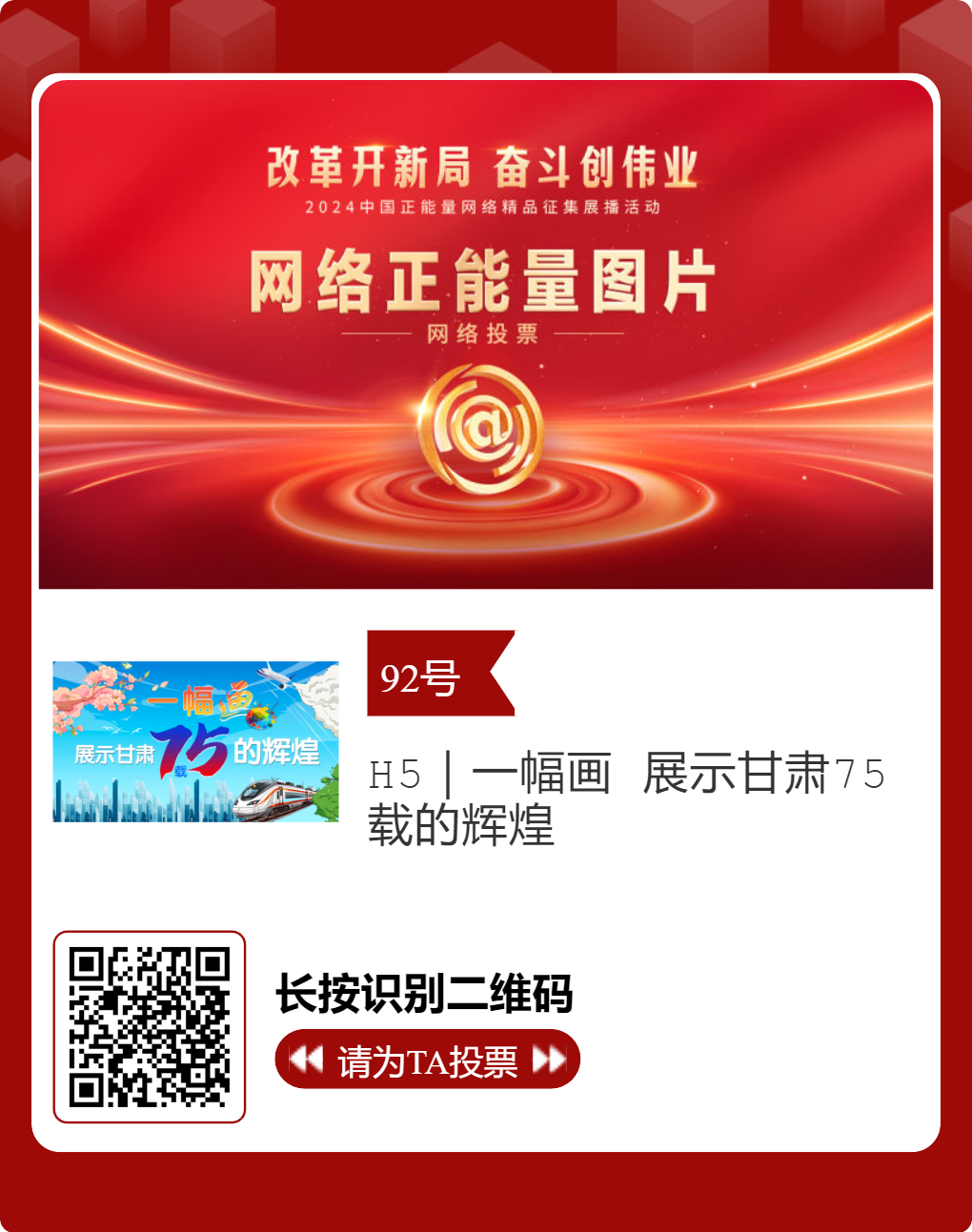 - 2025-02-172024中國正能量網(wǎng)絡(luò)精品,隴南入圍作品邀您投票!