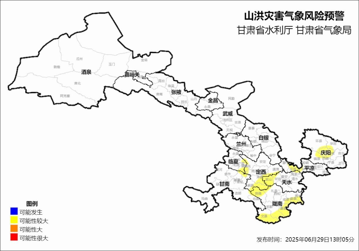 根據(jù)省氣象局《重大氣象信息專報》(2025年甘氣第10期),未來十天甘肅省多降水天氣,具有對流性強、小時雨強大、累積雨量大等特點,洪水災(zāi)害風(fēng)險高。6月29日13時,省水利廳、省氣象局聯(lián)合發(fā)布山洪災(zāi)害氣象風(fēng)險預(yù)警:預(yù)計,6月29日14時至30日14時,白銀市(景泰縣),武威市(古浪縣),定西市(臨洮縣、渭源縣、通渭縣、隴西縣、漳縣、岷縣),臨夏州(廣河縣、東鄉(xiāng)縣、康樂縣),甘南州(臨潭縣、卓尼縣、舟曲縣、迭部縣),天水市(秦安縣、甘谷縣、武山縣、張家川縣),隴南市(宕縣、禮縣、武都區(qū)、成縣、文縣、康縣、徽縣、兩當(dāng)縣),平?jīng)鍪校o寧縣、崆峒區(qū)、華亭市、莊浪縣),慶陽市(西峰區(qū)、慶城縣、環(huán)縣、華池縣、鎮(zhèn)原縣)等地區(qū)發(fā)生山洪災(zāi)害可能性較大(黃色預(yù)警)。