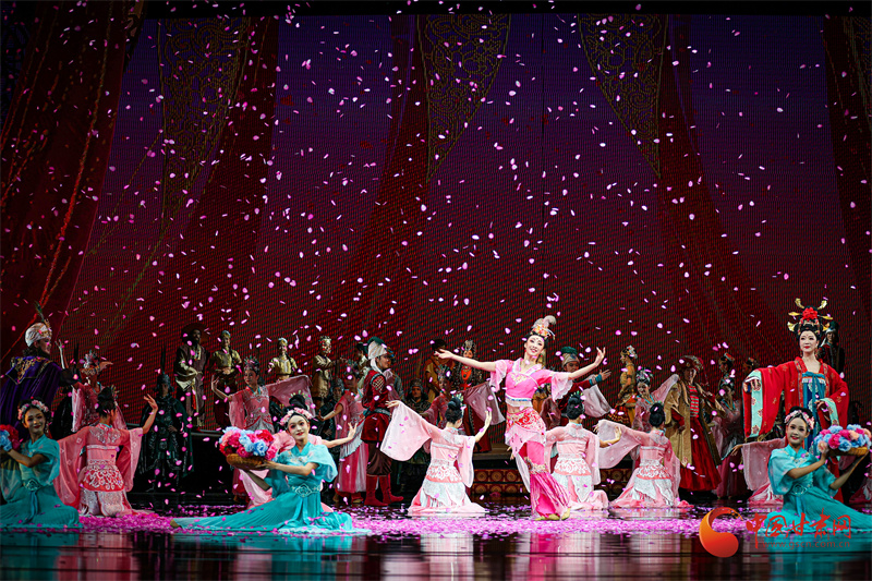 當(dāng)全息投影將莫高窟壁畫在舞臺上緩緩展開,當(dāng)駝鈴聲與電子樂編曲交織出跨越時空的和弦,觀眾相信,所謂“傳統(tǒng)”從不是凝固的標本,而是流動的生命,正如劇中穿越千年的花雨,落在古代畫工的筆端,落在當(dāng)代舞者的袖間,浸潤海內(nèi)外每一位觀演者的心田。劇中描繪的中外友好通商、民心交融場景,更是對新時代“一帶一路”倡議的生動詮釋。(甘肅省文化旅游廳供圖)