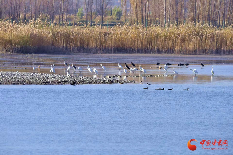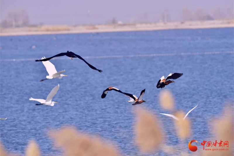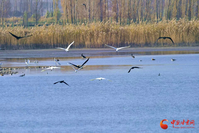 11月10日,初冬寒意漸濃,臨澤流沙河景區(qū)與雙泉湖水庫蘆葦叢間,響起遷徙鳥類的“集結(jié)號”。潔白的白鸛舒展雙翼、翩躚飛舞,成群麻鴨、鸕鶿緊隨而至,齊聚水域與葦蕩之間,為初冬景致添上靈動一筆,引得市民游客駐足抓拍。