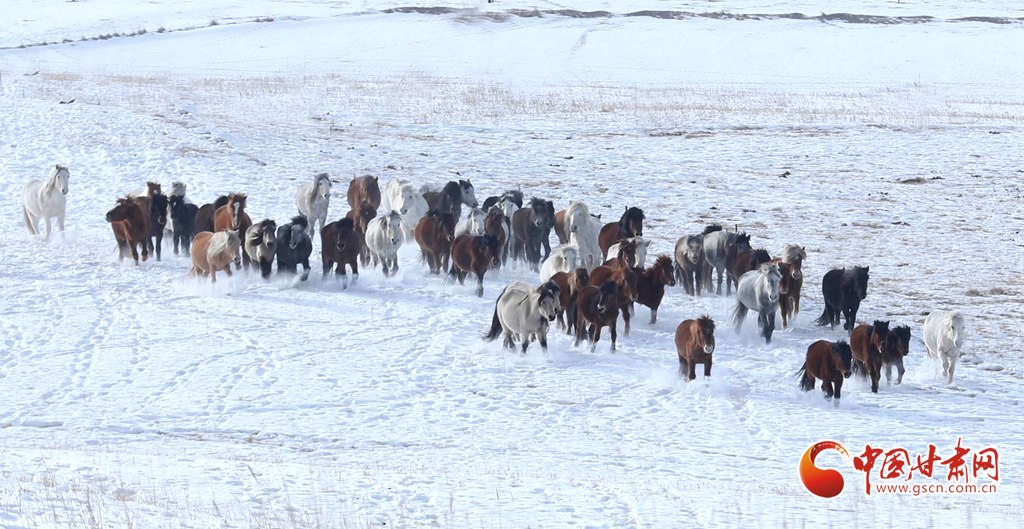 1月30日,張掖市肅南裕固族自治縣康樂草原上,康豐村牧民策馬馳騁,百匹駿馬踏雪奔騰,牧民們用這種獨特的方式迎接即將到來的新春。