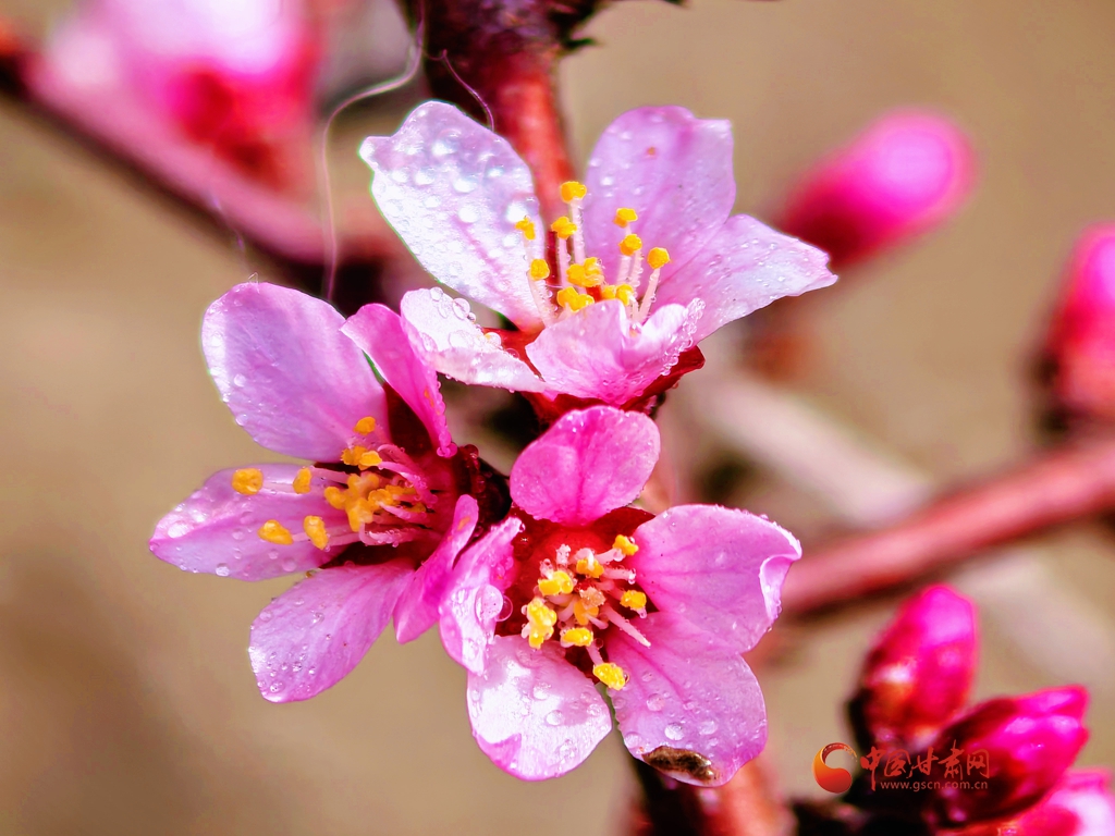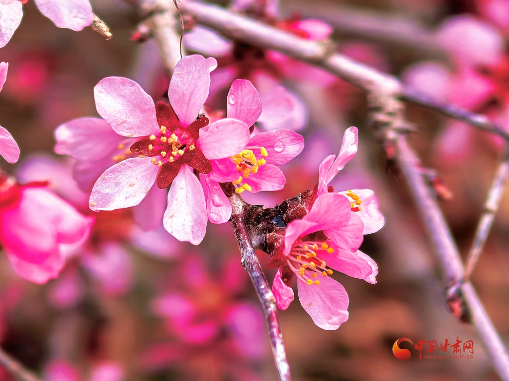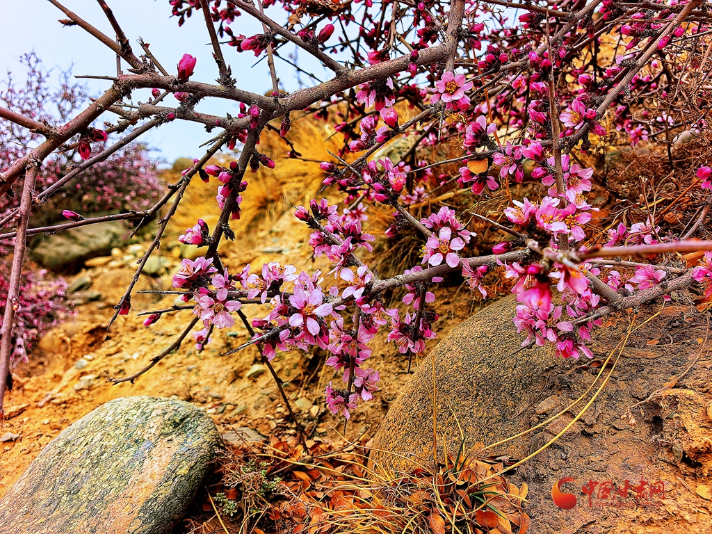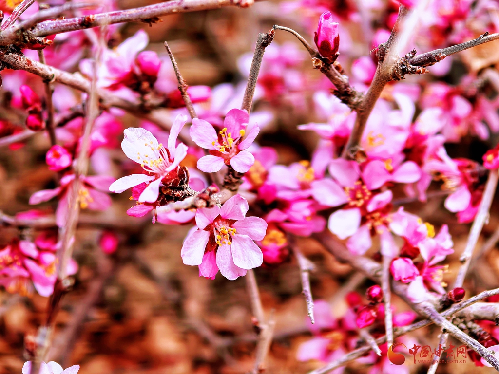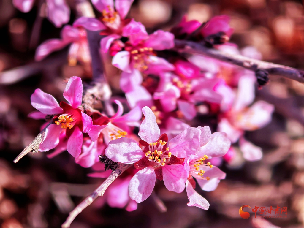 光禿禿的枝條上,不見半片新葉,只有一簇簇、一團團粉紅色的小花,密密匝匝地綴滿枝頭,擠擠挨挨,溫暖又熱烈。遠遠望去,像一縷輕盈的粉紅色云煙,輕輕飄落在蒼黃的山坡上,為沉寂的祁連山添上一抹難得的溫柔亮色;走近細看,花瓣薄如蟬翼,質(zhì)地輕盈細膩,嫩黃的花蕊纖細挺立,在寒風中微微顫動,看似柔弱的外表下,藏著不屈的傲骨。偶爾一場春雪突襲,潔白的雪花壓彎枝頭,花朵看似垂落不堪,可待到雪化風輕,它便立刻挺直腰肢,重新舒展花瓣。夜里寒霜凍得花瓣晶瑩透明,仿佛一碰就碎,可朝陽升起,寒冰慢慢消融,花朵依舊盛放如初,不曾輕易凋零半分。