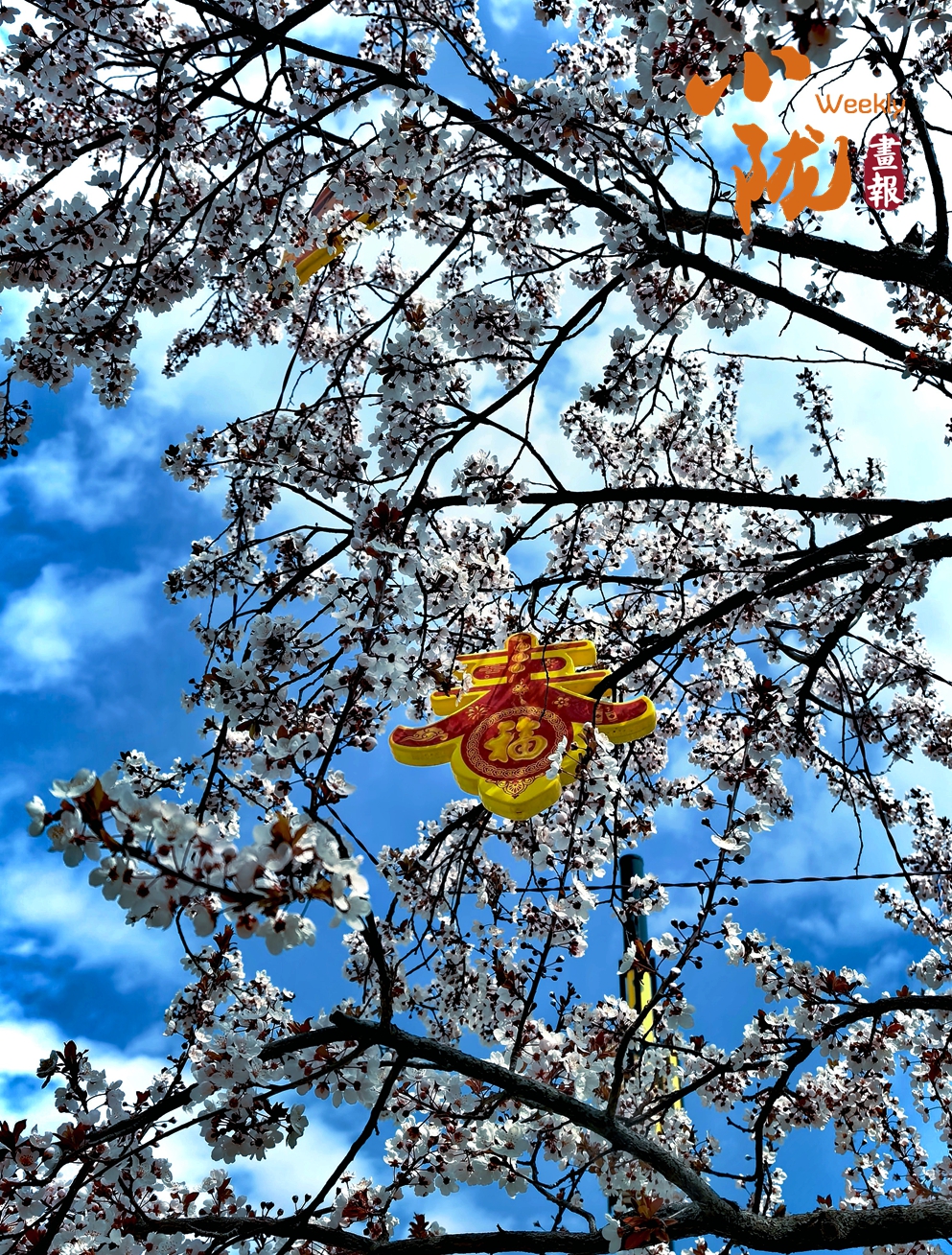 繁茂的櫻花綴滿枝頭,潔白的花瓣在藍(lán)天映襯下愈發(fā)清麗。枝椏間懸掛的“春福”掛飾,為春日街景添了暖意,風(fēng)過處,落英繽紛,滿眼浪漫與祥和。