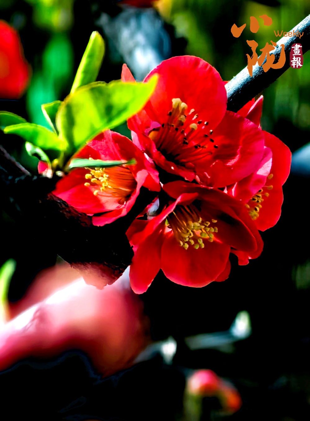 貼梗海棠花瓣緊緊貼在枝頭,嫩黃的花蕊在暖陽下格外醒目,新綠的葉片襯著灼灼花色,暈染出濃烈又鮮活的春日生機(jī)。
