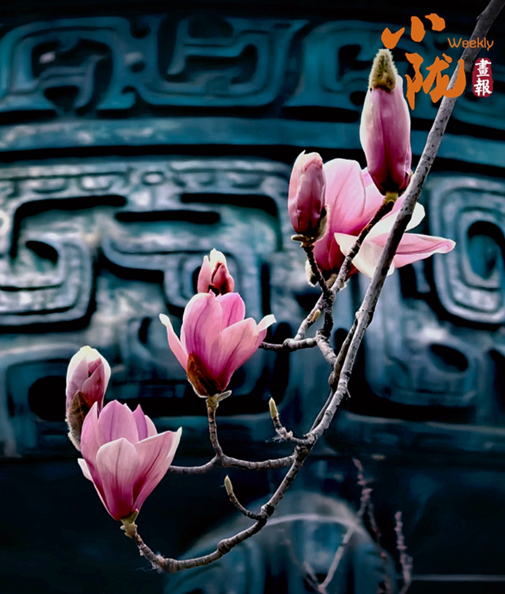古建的深色紋飾墻前,二喬玉蘭正次第綻放。粉紫的花瓣柔潤舒展,含苞的花蕾裹著絨毛,虬枝探出,將春日的雅致與古樸的街景相融,滿是詩意。