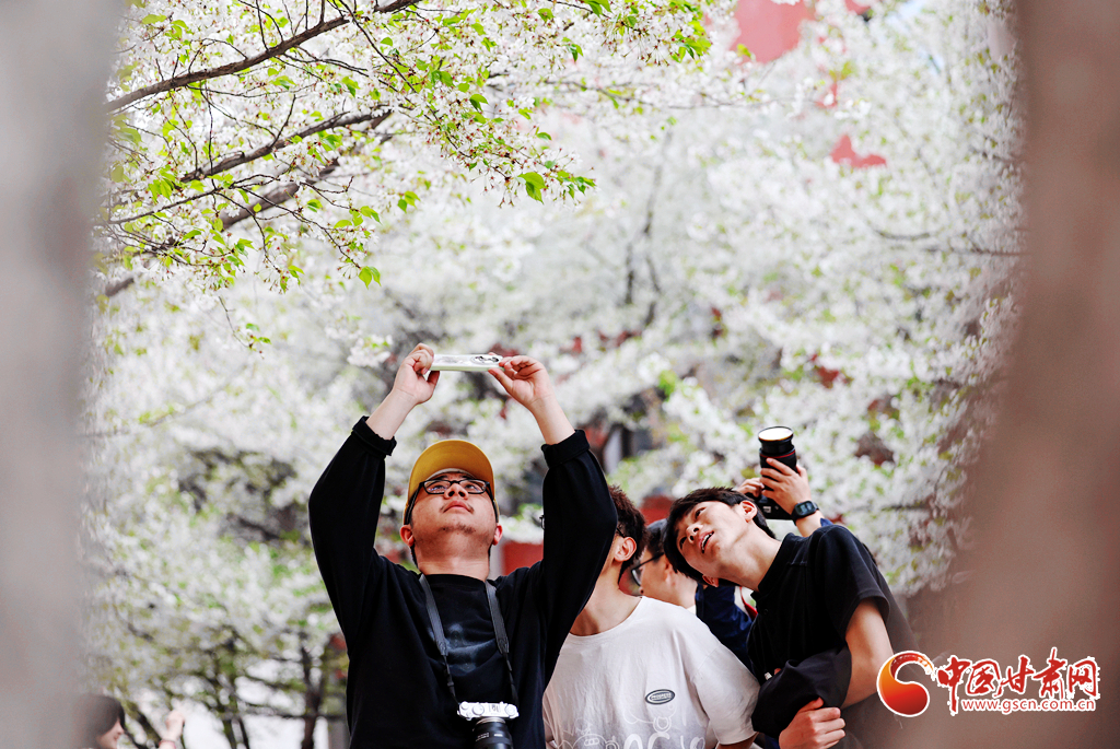 4月5日,學(xué)生們在蘭州大學(xué)校園內(nèi)拍攝櫻花。