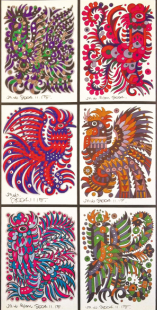 動物系列繪畫,從扎實而靈動的速寫與設計稿直至近似完美的正式作品,都蘊含了畫家捕捉物象的執(zhí)著與機敏,提煉造型的睿智與不懈,有了心血與摯愛的投入,那成竹在胸別具一格的小貓小狗小豬小鵝小猴也就躍然紙上呼之欲出了。在長方形的深色卡紙上,那銀色勾勒的活靈活現(xiàn)的百魚圖,讓我們沉醉于湛藍的海洋世界;在四方形的白色鏡框中,那七彩斑斕的百雞圖,讓我們迷戀于鄉(xiāng)間的濃郁風情;還有鞠躬盡瘁一生奉獻膂力雄強的牛群系列,馳騁千里挾帶雄風英姿勃勃的駿馬圖騰……