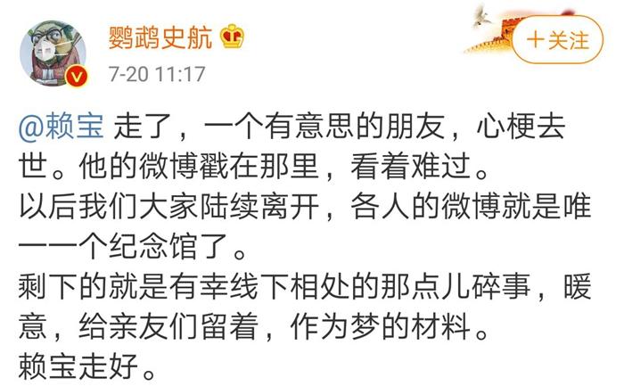 “以后我們大家陸續(xù)離開,各人的微博就是唯一一個(gè)紀(jì)念館了。剩下的就是有幸線下相處的那點(diǎn)兒碎事,暖意,給親友們留著,作為夢(mèng)的材料。賴寶走好。”史航寫道。?