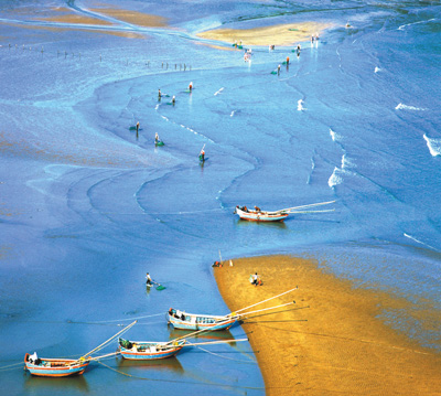 功夫不負(fù)有心人。經(jīng)過漫山遍野地毯式的尋覓,鄭德雄一行把霞浦海灘的拍攝點(diǎn)摸了個遍,也拍出了一幅幅漂亮的好作品。那照片上的霞浦真是美?。核{(lán)色的海水,金色的沙灘,種海帶的竹竿依序林立,滿載的漁船停泊在靜靜的港灣,趕海人背著沉甸甸的魚簍,正走在金色的沙灘上……