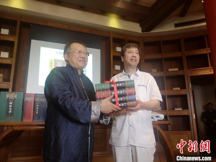 中新網杭州8月26日電(童笑雨)8月26日,浙江圖書館(下稱“浙圖”)向中國國家圖書館(下稱“國圖”)贈送影印精裝本文瀾閣《四庫全書》。據(jù)悉,影印本文瀾閣《四庫全書》入藏國圖,尚屬首次。浙江圖書館館長褚樹青表示,文瀾閣本《四庫全書》重新回到北京,是浙江人民的回贈,也是一次文化交流。