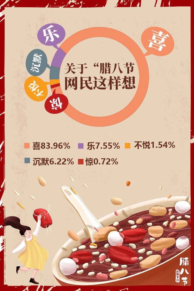 雖然今年多地的臘八節(jié)活動因疫情而取消,但是人們對于團圓、祥和、富裕、康寧、平安的期盼從未改變。有關“臘八”的網(wǎng)民情緒分布中,“喜”占83.96%,“樂”占7.55%。總體來說,開心喜悅的情緒占到了九成以上。