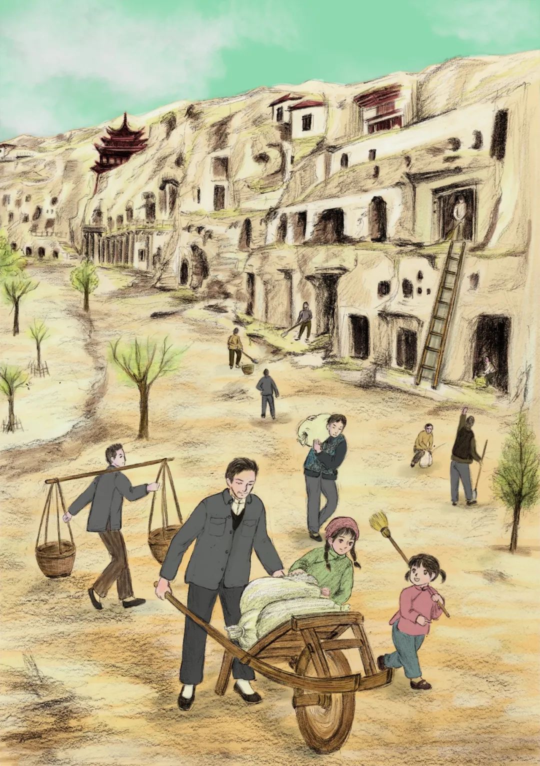 《敦煌小畫師》的故事,以民國(guó)時(shí)候國(guó)立敦煌研究所初創(chuàng)時(shí)期為背景,以一個(gè)小女孩欣潔的眼光,摹刻了一群以敦煌為文化藝術(shù)圣地而奮斗而獻(xiàn)身的藝術(shù)家和學(xué)者群體,這個(gè)群體以欣潔的父親為代表,他們舍棄溫暖濕潤(rùn)的家鄉(xiāng),而遠(yuǎn)赴那個(gè)遙遠(yuǎn)荒涼的所在。因?yàn)槟抢镉卸鼗停驗(yàn)槟抢锉4嬷磺Ф嗄昵暗恼滟F文物和彩塑壁畫,還因?yàn)槟抢锛毙栌腥藖?lái)保護(hù)、修復(fù)和弘揚(yáng)。他們來(lái)了,他們?cè)谶@片戈壁之地安家扎根,在動(dòng)蕩的社會(huì)時(shí)局下開始了為家為國(guó)的擔(dān)當(dāng),也開始了人生理想和價(jià)值的實(shí)現(xiàn)。這一切,以一個(gè)孩子的眼光來(lái)看,幾乎就是交織著欣喜和失望、歡喜與憂愁,從茫然無(wú)知到誠(chéng)摯熱愛的一段生動(dòng)故事?!抖鼗托‘嫀煛饭适虑楣?jié)的設(shè)定,有起伏有高潮,有親情之愛,有田野之趣,更有人與人之間和諧相助的人性之美,讀起來(lái)有聽一首鄉(xiāng)村音樂(lè)的韻律感。我覺得,一部?jī)?yōu)秀的兒童文學(xué)作品,應(yīng)該就是這個(gè)樣子。