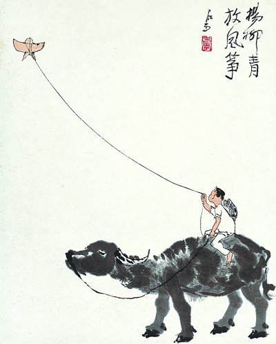 此后,隨著學(xué)識的增加,關(guān)于牛的意象不斷拓展。“天蒼蒼,野茫茫。風(fēng)吹草低見牛羊”,這是南北朝時期的《敕勒歌》,廣袤的草原為牛提供了開闊的活動空間與豐贍的食物,多么安詳自在的景象呀!“隔岸橫州十里青,黃牛無數(shù)放春晴。船行非與牛相背,何事黃牛卻倒行。”這是楊萬里的詩作《過大皋渡》,黃牛不會倒行,而是船行河中水流太急,生活的趣味里悄然透著淡淡的哲理。“門外一溪清見底,老翁牽牛飲溪水。溪清喜不污牛腹,豈畏踐霜寒墮趾。”這是陸游詩作《飲牛歌》,用老翁飲牛的潔凈溪水,比襯自我的廉潔之志。往后看更見意趣,“牛能生犢我有孫,世世相從老故園”,借助牛繁衍生犢,渲染門庭興旺,而且世代情系故園,真是不忘初心呀!“草滿池塘水滿陂,山銜落日浸寒漪。牧童歸去橫牛背,短笛無腔信口吹。”這是宋代雷震的詩作《村晚》,鄉(xiāng)村的黃昏恬靜怡和,靜在草叢,靜在池塘,靜在倒映于水面的“山銜落日”,這未免有點沉寂吧?打破沉寂的是牛,是趨步前行的牛,還有牛背上飛出的短笛聲,這聲音毫無約束,信口吹響,自由飛揚。