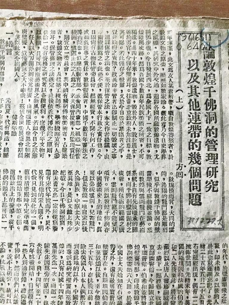 向達(dá)先生曾先后兩次考察敦煌,第一次是在1942年4月,中央研究院組織西北史地考察團(tuán),其中的歷史考古組由中央研究院歷史語(yǔ)言研究所、中央博物院與北京大學(xué)聯(lián)合組成,向達(dá)代表北大并擔(dān)任歷史考古組主任。在這次考察中,他在給友人、南京博物院院長(zhǎng)曾昭燏的信件中講述了他第一次看到敦煌莫高窟時(shí)的激動(dòng)心情,同時(shí)對(duì)于莫高窟受到自然和人為的毀壞而感到痛心。他用三天的時(shí)間寫成了一萬(wàn)多字、此后對(duì)敦煌學(xué)有重大影響的《論敦煌千佛洞的管理研究以及其他連帶的幾個(gè)問(wèn)題》,署名“方回”寄給了傅斯年,后經(jīng)傅斯年推薦,在重慶的《大公報(bào)》連載發(fā)表,文中提出將千佛洞收歸國(guó)有,由學(xué)術(shù)機(jī)構(gòu)進(jìn)行管理,開展研究工作等建議。此文發(fā)表,一石激起千層浪,直接推動(dòng)國(guó)立敦煌藝術(shù)研究所于1944年成立。研究所成立后,常書鴻任所長(zhǎng)。這也開啟了“敦煌學(xué)”長(zhǎng)流不息的淵源。樊錦詩(shī)后來(lái)也撰文稱:“他(向達(dá))文章中提出的關(guān)于保護(hù)和管理的具體建議,被后來(lái)成立的敦煌藝術(shù)研究所采納,成為敦煌石窟保護(hù)和管理的參照。向達(dá)提出的‘不可輕易剝離壁畫’的主張,也是敦煌研究院幾十年來(lái)在壁畫保護(hù)和管理中一直恪守的紀(jì)律和原則。”
