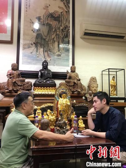 圖為葛亮(右)采訪澳門木雕佛像非遺傳承人 人民文學出版社供圖