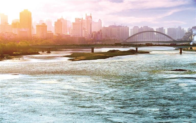 河分南北,勢接?xùn)|西。舒寧陜之博帶廣袖,帶青藏之峨冠雪衣。山逶迤而續(xù)祁連,水澎湃而瀉右?guī)?。匯洮湟之迤邐,有容乃大;與華夏之康莊,唇齒相依??睾游髯呃龋怨哦?;俯渭涇秦川,由朝至夕。綴葫蘆狀岸渚坪灘,幾多古渡;依膏腴處坡谷盆地,即就蕃息。筑虹蜺經(jīng)百年,鐵橋第一;盤游龍於今朝,立交數(shù)十。去病鞭地,五泉山勝于秀逸;永誠建院,白塔寺高于云齊。指點(diǎn)九州,大禹登九州之臺;漂流黃河,洋人恐招手之磯。草覆馬銜而能牧,林茂興隆云可棲。繞營盤高嶺排五,峙雄關(guān)沿河有七。留千古名,白馬浪細(xì)聽湍流不息;鎖萬代鑰,金城關(guān)只留站牌不奇。雷壇留碑,金天觀曾殿宇壯麗;華林無寺,節(jié)能燈照幽路石基。湍流黃河,九曲回腸依然東去;水轉(zhuǎn)輪盤,十方高地亦滿紛披。