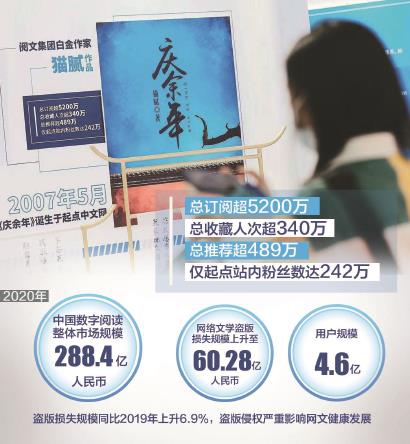 有數(shù)據(jù)顯示,2020年中國網(wǎng)絡文學市場規(guī)模為288.4億元,網(wǎng)絡文學通過IP全版權(quán)運營間接或直接影響了動漫、音樂、影視、游戲等合計約2531億元的市場,對數(shù)字文化產(chǎn)業(yè)的影響范圍超過40%。但令人痛心的是,2020年中國網(wǎng)絡文學盜版損失規(guī)模達60.28億元,同比上升6.9%。