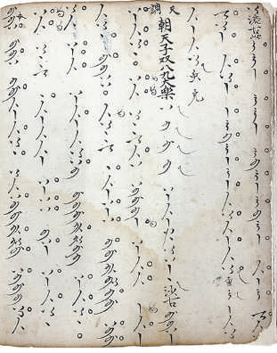 二是音位型曲譜,以各類符號指代樂器上的音位。使用這類曲譜,必須首先明確弦樂器的定弦、定品方式,管樂器的開孔標準和按孔、吹奏方法,才能確定每個音位的實際音高。正因如此,音位譜往往與樂曲宮調(diào)密切相關(guān)。同一份譜子,換用不同宮調(diào)演奏,音響大不相同。20世紀初,敦煌藏經(jīng)洞曾發(fā)現(xiàn)一份五代時期的曲譜,采用20個琵琶音位符號記錄,是目前已知這類曲譜的早期代表。