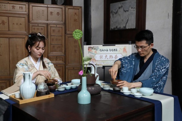“詩(shī)畫江南 行閱典籍”曬書活動(dòng)之“宋式點(diǎn)茶”。費(fèi)騰輝攝