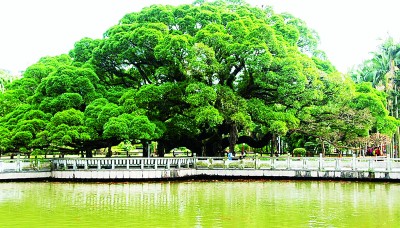 擁有古樹(shù)的城市就是擁有歷史的城市。福州古榕遍布,四季常青,是城市、市民生活與樹(shù)木的完美結(jié)合,是風(fēng)景的自然生長(zhǎng),是歷史根深葉茂地屹立。福州古榕以樹(shù)齡長(zhǎng)、歷史久、數(shù)量眾而著稱(chēng)。見(jiàn)證福州城市史的,當(dāng)首推鼓山國(guó)家森林公園、八一水庫(kù)旁,福州無(wú)人不知的已近千歲,被譽(yù)為福州榕樹(shù)王的古榕。相傳,這棵古榕是張伯玉所栽植的兩棵樹(shù)苖,光陰荏苒,同氣相求,如今兩棵榕樹(shù)相互糾結(jié)、勾連、纏繞、親密,已無(wú)分彼此。其冠幅達(dá)1300米,可容納千人在樹(shù)下談古論今,聊天遮陰。遠(yuǎn)望,似綠色陵巖;近看,知其為榕也,密密的枝葉把近午的陽(yáng)光切割成碎花點(diǎn),散落、閃亮在榕樹(shù)下的草坪和地衣上。初訪(fǎng)者或?yàn)橛牣悾嘿即笠豢霉砰艆s不見(jiàn)氣根,知榕者會(huì)告訴你,這是一株碩大、古老而不生氣根的細(xì)葉榕。因其冠幅日益長(zhǎng)大,為了支撐沉重的樹(shù)冠、預(yù)防主干折損,便制作了若干石柱,砥柱其間。古榕下有湖塘,錦鯉游泳,不時(shí)生出紅色漣漪。旁有一碑,上刻:榕蔭照水波心漾,觀(guān)魚(yú)猶勝花間行。
