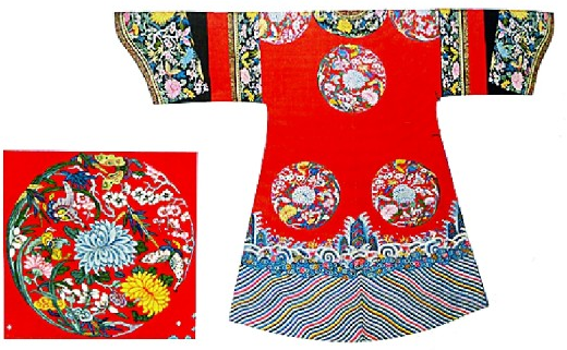 故宮藏大紅緙絲彩繪八團梅蘭竹菊紋夾袍及紋樣 選自《遇見中國服飾藝術(shù)》