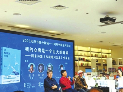2023天府書展,各種名家分享會(huì)讓讀者應(yīng)接不暇。除了成都世紀(jì)城新會(huì)展中心主會(huì)場(chǎng),分會(huì)場(chǎng)的活動(dòng)也精彩紛呈。10月15日下午,在西部文化產(chǎn)業(yè)中心阿來(lái)書房,阿來(lái)、葉舟、梁平三位名家開啟“我的心房是一個(gè)巨大的蜂巢——阿來(lái)詩(shī)集《從梭磨河出發(fā)》分享會(huì)”。三人上演老友記,分享會(huì)由阿來(lái)的青春期談起,氛圍詼諧幽默、愜意深情。