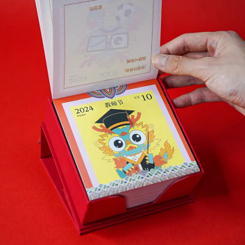 如意取出第一層里紅紅的燙金書刊盒,馬上發(fā)現(xiàn)了它的小機(jī)關(guān):原來(lái)盒蓋上有個(gè)吸鐵石,把它翻過(guò)來(lái),就可以25度傾斜地放在書桌上,舒服地翻閱一整年的“日子”;每一天的頁(yè)面都能被絲滑地撕下,作為小書簽,插在課本讀物中。