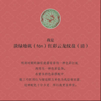 翻開(kāi)新年伊始的“元旦”頁(yè),映入眼簾的是一個(gè)綠色的盤子,上面有三條雄勁矯健的“龍爺爺”,它們來(lái)自清代吧!如意輕輕撕下日歷頁(yè)翻到反面,讀起文物小故事:“我是淡綠地礬(fán)紅彩云龍紋盤……”
