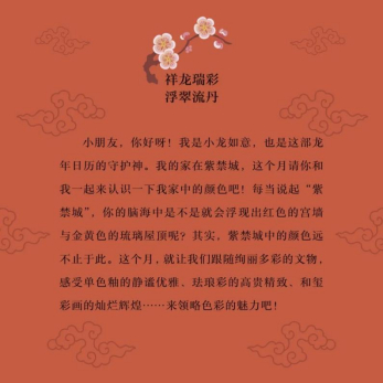 媽媽告訴如意,這是一個(gè)“時(shí)光寶盒”,里面有來(lái)自故宮不同領(lǐng)域的10位專家從故宮館藏中精選的262件“龍”文物,它們每天登場(chǎng)介紹自己的故事,還會(huì)請(qǐng)小讀者幫忙,每日動(dòng)手給日歷中的小龍如意卷軸貼出一身漂亮的龍鱗。