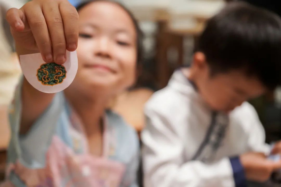 每個(gè)龍文物故事上方,也印有當(dāng)天文物的小圖,它周圍伴有一圈半圓打孔的攏線。如意用小手沿著攏線輕輕一摳,一片小小的“龍鱗”就落在了手心。原來(lái),它就是今天的“成長(zhǎng)值”啊。