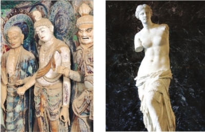 可是,“脅侍菩薩微笑著,在她低垂的眼中可能根本沒有勝負這回事。這種眼神是利他而非個人的……當我們在45窟佛龕前微微俯下身子之時,溫暖的奇跡出現了,她正慈祥地看著你。一位是由堅硬的大理石所雕,另一位是由敦煌本地黏土所塑,維納斯和脅侍菩薩似乎代表了兩種生活態(tài)度。假如她們在盧浮宮中相遇,談論起美。維納斯可能會唱起女詩人薩福的詩歌:‘你愛的就是美的。這容易解釋。’脅侍菩薩則依然保持微笑,靜靜地看著維納斯”。