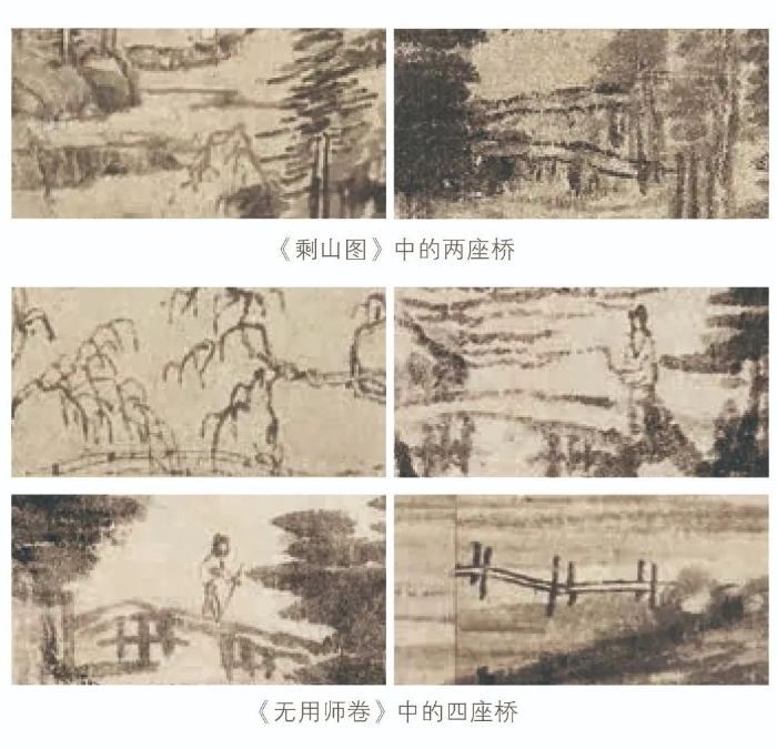 《富春山居圖》全卷共畫有六座橋,其中《剩山圖》上有兩座橋,《無用師卷》上有四座橋。讓我們先找到其中的一座橋,它在梁詩正書寫的“鑒定”開頭部分正下方。你有沒有發(fā)覺,這座橋最為特殊。