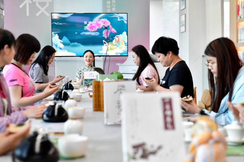 5月23日,市民在日照市東港區(qū)城市書(shū)房櫻花園館學(xué)習(xí)茶藝。