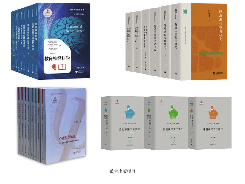 上教社密切關(guān)注新時(shí)代教育發(fā)展的重大理論問題與現(xiàn)實(shí)問題,響應(yīng)國(guó)家教育發(fā)展戰(zhàn)略需求,精心布局學(xué)術(shù)專業(yè)出版“大項(xiàng)目”,連續(xù)入選國(guó)家重點(diǎn)出版物出版規(guī)劃、2013—2025年國(guó)家辭書編纂出版規(guī)劃,獲國(guó)家出版基金資助。這其中除前文中的大型專科工具書,還包括一系列教育與心理學(xué)原創(chuàng)研究和前沿研究成果:由中國(guó)教育史學(xué)者孫培青編著的“隋唐五代教育與考試研究叢書”,構(gòu)建了反映隋唐五代教育與考試全貌的教育理論體系和文獻(xiàn)資料體系,是中國(guó)教育史學(xué)科建設(shè)的一項(xiàng)學(xué)術(shù)文化積累工程;《中國(guó)課程史》以現(xiàn)代課程理論為分析框架,以歷史線索展現(xiàn)中國(guó)學(xué)校課程的新陳代謝;“教育神經(jīng)科學(xué)譯叢”(9冊(cè))是我國(guó)首個(gè)聚焦教育神經(jīng)科學(xué)這一國(guó)際教育研究前沿領(lǐng)域的學(xué)術(shù)譯介系列;《中國(guó)傳統(tǒng)德育心理學(xué)思想新論》系統(tǒng)挖掘整理中華優(yōu)秀傳統(tǒng)文化中蘊(yùn)含的德育心理學(xué)思想,構(gòu)建中國(guó)特色心理學(xué)話語體系;我國(guó)第一套以大心理學(xué)觀,從本土心理學(xué)視角系統(tǒng)探索和解讀不同形態(tài)心理學(xué)的學(xué)術(shù)系列“心理學(xué)形態(tài)研究系列”(6冊(cè)),全景考察心理學(xué)的命運(yùn)與前途,深入探索中國(guó)本土心理學(xué)的選擇與突破;《弗洛伊德主義新論》(三卷)匯聚國(guó)內(nèi)弗洛伊德主義研究領(lǐng)域的權(quán)威學(xué)者,歷史展現(xiàn)弗洛伊德理論的百年發(fā)展歷程,提供弗洛伊德主義研究的“全景圖”。這些重大出版項(xiàng)目為構(gòu)建中國(guó)特色自主知識(shí)體系,建設(shè)中國(guó)教育學(xué)和心理學(xué)學(xué)科體系、學(xué)術(shù)體系、話語體系發(fā)揮了重要作用。