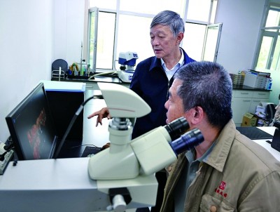 9月26日,敦煌研究院院長蘇伯民(左)與同事一起在實驗室觀察實驗數(shù)據(jù)。