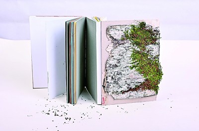 除了材料語言的拓展,展覽中的許多作品還展現(xiàn)出設計形式的創(chuàng)新與突破。如陳潔瑩的《蟬鳴樹語》聚焦了蟬絢爛而短暫的生命軌跡。書籍的裝幀方式采用經(jīng)折裝,當書本徐徐展開,一棵參天古樹好似拔地而起,貫通全書首尾。由樹根處為起點向上閱讀直至樹冠,可見蟬從卵枝到若蟲,再經(jīng)歷脫殼變?yōu)槌上x的歷程。經(jīng)由巧妙的形式設計,生命的輪回在書頁間流轉(zhuǎn),詮釋出動人的自然之力。