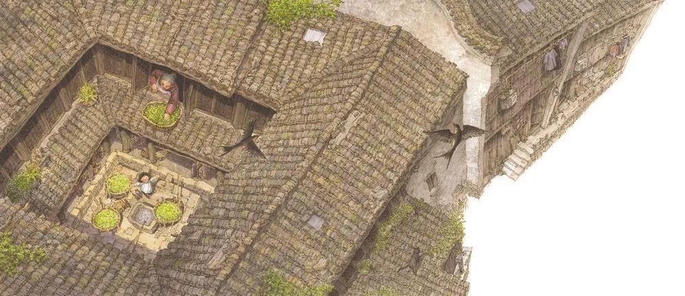 整個(gè)繪本主要采用寫實(shí)性的現(xiàn)實(shí)主義風(fēng)格,繪畫者付出極大的耐心和精力,用鋼筆和馬克筆細(xì)致描繪每一片磚瓦、每一塊石板、每一叢花葉、每一扇門窗,甚至每一條木紋、每一絲波紋、每一道皺紋……力求真實(shí)地呈現(xiàn)物像的肌理和質(zhì)感,讓人身臨其境。同時(shí),也加以寫意的手法,用柔和的淡彩渲染懷舊的色調(diào)和溫馨的氛圍。尤其值得稱道的是,在多幅畫面中,以丫丫等待的“神秘的客人”——燕子為一種符號(hào)角色,無論之于畫面還是主旨,都有其獨(dú)到的意義。燕子飛翔于水面和屋宇之上,給靜態(tài)的環(huán)境帶來靈動(dòng)之感,有時(shí)還能平衡畫面的結(jié)構(gòu)。燕子是江南春天的使者,也是童年喜愛的精靈。蘇軾和歐陽修各自的《蝶戀花》詞中都寫到了燕子,前者是:“花褪殘紅青杏小。燕子飛時(shí),綠水人家繞。”后者是:“畫閣歸來春又晚。燕子雙飛,柳軟桃花淺。”這一古典意象在繪本畫面中的反復(fù)出現(xiàn),羽翼間展開了江南的典雅、清麗以及輕愁。作品里的另一種動(dòng)物是時(shí)常縈繞主人腳邊的貓咪,增添了祥和的家居趣味,也代表一種熟稔的情感皈依。原本黑瓦白墻的江南民居在畫面中作為背景或前景,灰中帶彩、冷中帶暖,既體現(xiàn)了時(shí)間的流逝,也象征著永恒的家園。外公背著丫丫雨夜歸家的場景以多個(gè)連貫畫面變換角度來鋪展,暗夜中始終有溫暖的燈光照亮回家的路,也有堅(jiān)實(shí)的后背托舉稚嫩的夢,給孩子以安全、安穩(wěn)和安心。