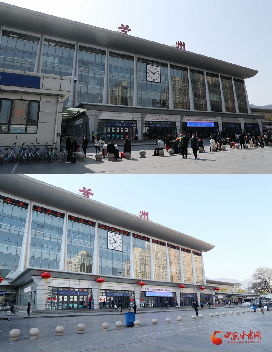 3月3日(圖上)與2月4日(圖下)拍攝的蘭州火車站