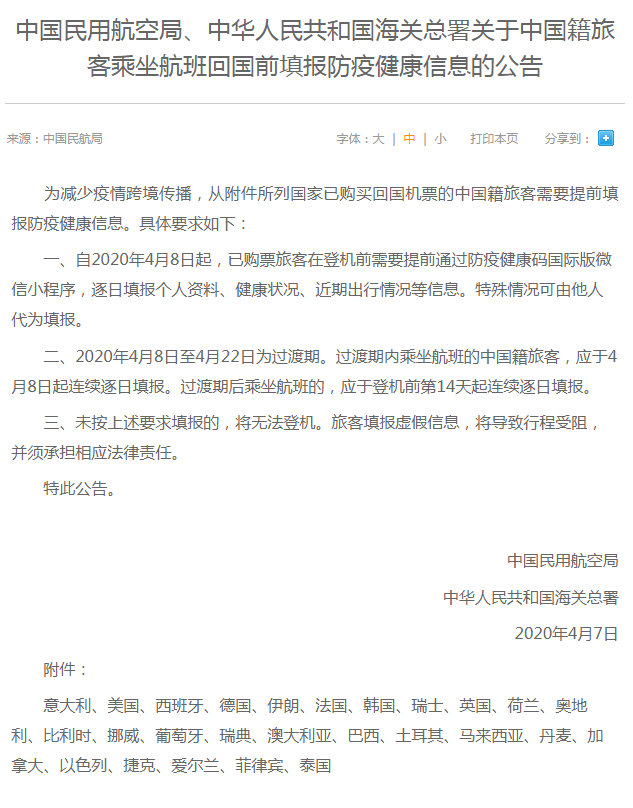 中國民用航空局、中華人民共和國海關(guān)總署4月7日聯(lián)合發(fā)布《關(guān)于中國籍旅客乘坐航班回國前填報(bào)防疫健康信息的公告》(以下簡稱《公告》)?!豆妗分赋?,自4月8日起,從意大利、美國、西班牙等26個(gè)國家已購買回國機(jī)票的中國籍旅客需要在登機(jī)前提前填報(bào)防疫健康信息,包括逐日填報(bào)個(gè)人資料、健康狀況、近期出行情況等。旅客未按要求填報(bào)的,將無法登機(jī);填報(bào)虛假信息,將導(dǎo)致行程受阻,并須承擔(dān)相應(yīng)法律責(zé)任。