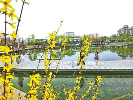 四月春日,五彩繽紛。小西湖公園里,迎春花、桃花等競(jìng)相開放,引來蜜蜂、蝴蝶穿梭其中,微風(fēng)拂過,飄來陣陣花香。清澈的湖水,嫩綠的草地,公園內(nèi)四處皆有春天的顏色。