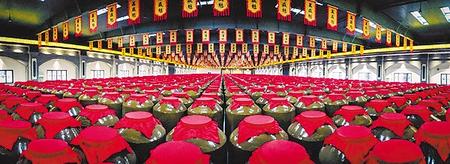 來到養(yǎng)酒館的三樓,這里儲存了大量的陶壇,它們整齊有序地擺放著,在陶壇上面懸掛著徽縣歷史上幾十家著名的老字號釀酒作坊的名號。“不要小看這些陶壇,它們里面可裝著金徽的‘寶貝’。”講解員說,這里面承裝著金徽的老酒,也是高端酒。每一壇都有標(biāo)簽,注明了年份。