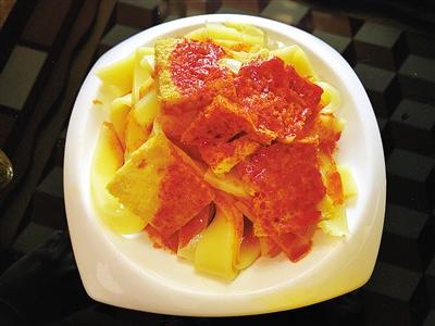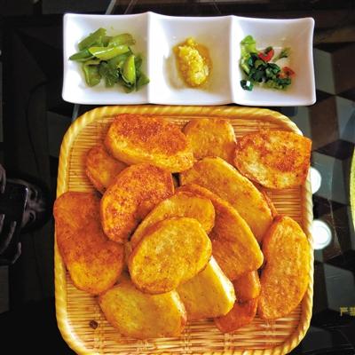 炕鍋洋芋是臨夏農(nóng)家樂里面常見的一道特色小吃,在臨夏,煎、烙之類的烹飪方式都被稱作炕,炕鍋洋芋因此得名。洋芋切片后,直接放熱油中兩面煎透??诲佈笥蟮淖龇m不復(fù)雜,但其對(duì)于火候的要求卻極其嚴(yán)苛,多一分會(huì)焦,少一分則不熟。